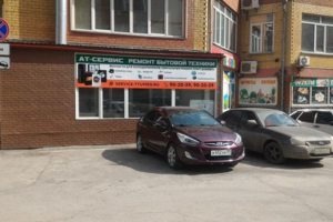 Большие пластиковые окна, с вывеской АТ-СЕРВИС, цокольный этаж.